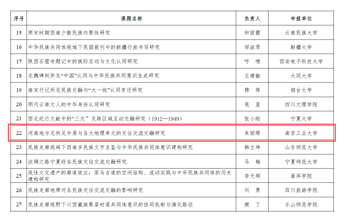 近日,国家民委科研项目管理办公室发布了国家民委民族研究项目2025年度公开招标课题评审结果公示,bv伟德国际1946朱丽晖老师申报的《河南地方志所见中原与各大地理单元的交往交流交融研究》获得立项,这也是bv伟德国际1946首次获批该项目(省部级项目)。