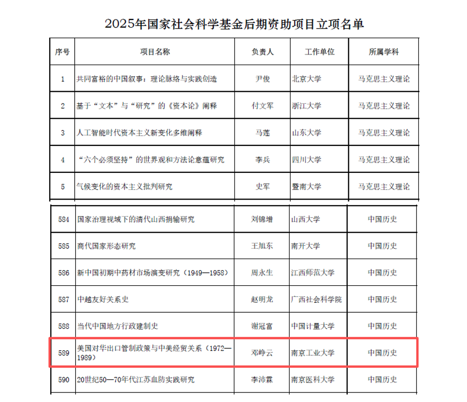 近日,全国哲学社会科学工作办公室发布了2025年国家社会科学基金后期资助项目立项评审结果,bv伟德国际1946邓峥云老师申报的课题《美国对华出口管制政策与中美经贸关系(1972—1989)》喜获立项。