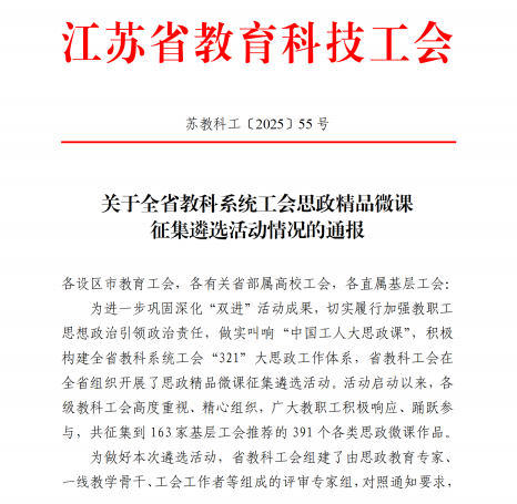 本次评选由江苏省教育科技工会主办,旨在巩固“双进”活动成果,加强思想政治引领、打造“中国工人大思政课”品牌,构建全省教科系统工会“321”大思政工作体系。